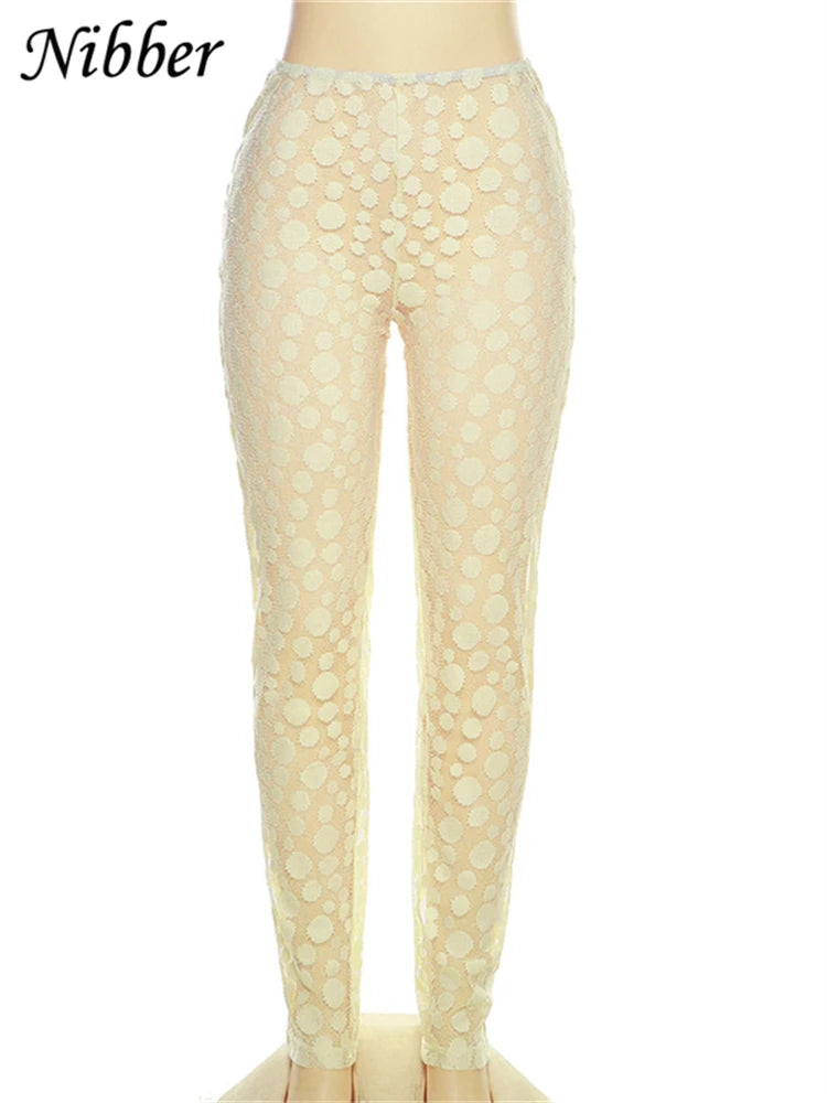 Nibber Embroidered Mesh Dots Leggings Women See Through Mid-waist Stretch Pants Skinny Ladies Trousers Elastic Streetwear Bottom