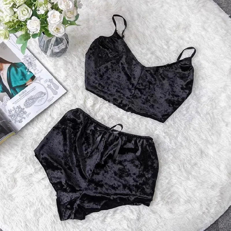 Sexy Velvet Pajamas V-Neck Lingerie Two Sets Women Suspenders Short Pants Loungewear