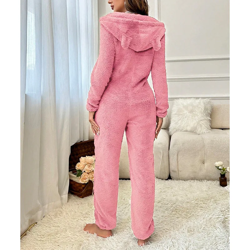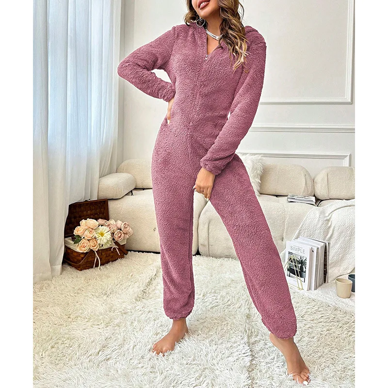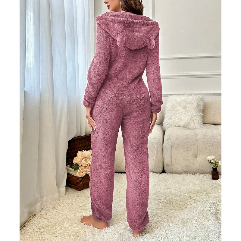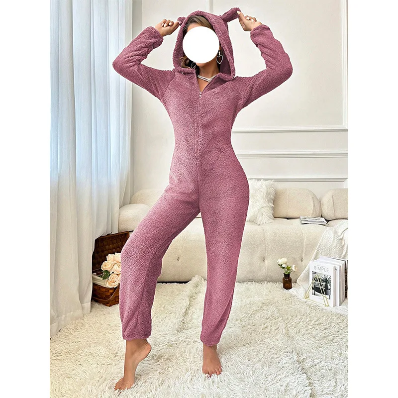 Warm Fleece Pajamas Jumpsuit Lady Autumn Winter Homewear Hooded Nightwear Coral Fleece Onesie Long Sleeve Loungewear Sleepwear