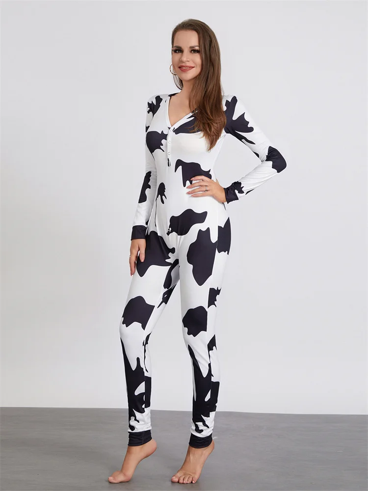 Women Buttoned Flap Jumpsuits Sleepwear Cow Printed Long Sleeve V Neck Bodycon Romper Spring Fall Loungewear