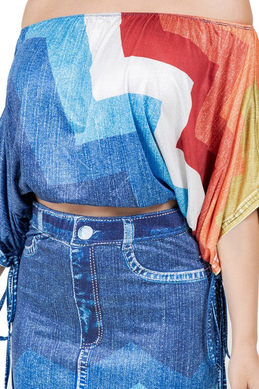 Sexy fashion style,3D print fake denim look, off-shoulder 3/4 batwing sleeves top, elastic waist midi skirt